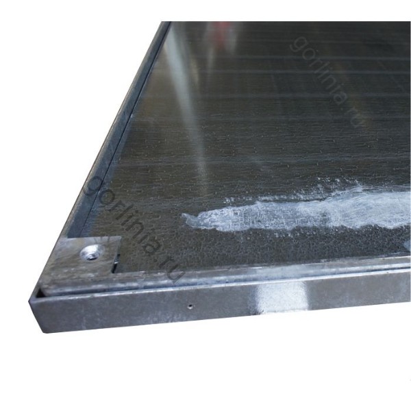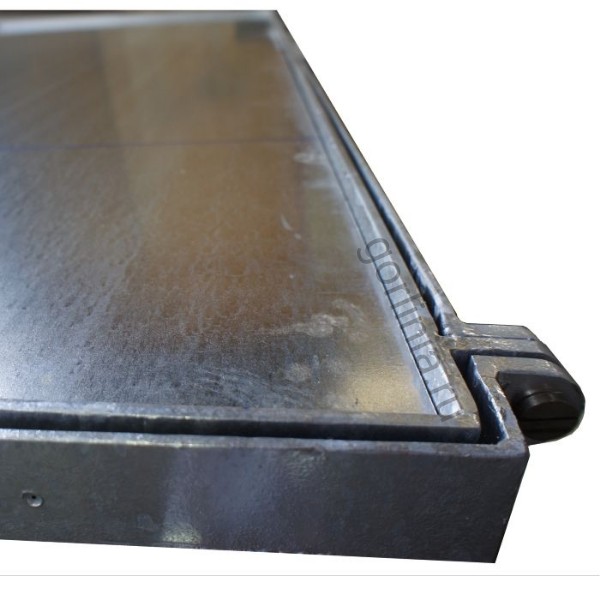 Рама сварена из сортового уголка 50х5. Каркас двери с видимым кантом выполнен с обвязкой из профиля 50х25 с ячейкой 300х300 в осях. Дно крышки закрыто оцинкованным листом 2 мм с расчетной глубиной 20 или 30 мм в зависимости от толщины доски декинга. Элемент петли реализован выносными разъемными шарнирами.