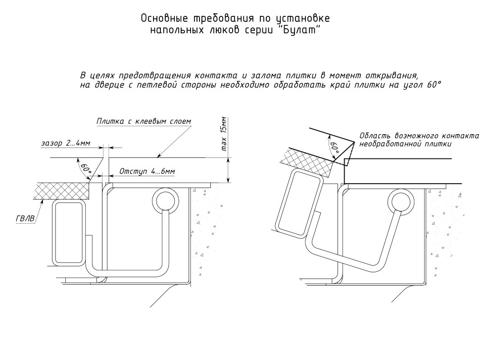 При формировании напольного отверстия обратите внимание на защитные кожухи шарниров. Коробки выходят за посадочную отметку по плечевой стороне.