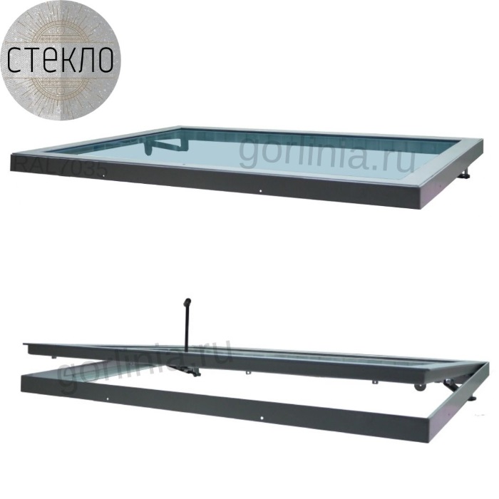 Откидной механизм: скрытые петли по стороне 1500 с одной осью вращения, вспомогательные газовые амортизаторы (удерживающие створку в открытом положении), встроенная защелка с личинкой под шестигранную ручку.