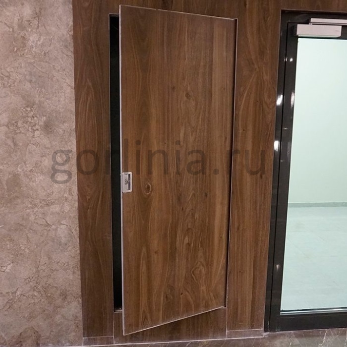 Створка распашная, открывается на себя на опорных подшипниках осевых петель. Заполнена листами ГВЛ и ГСП-DF с минватой в полости. Класс огнестойкости EIS 60. Сертифицировано.
