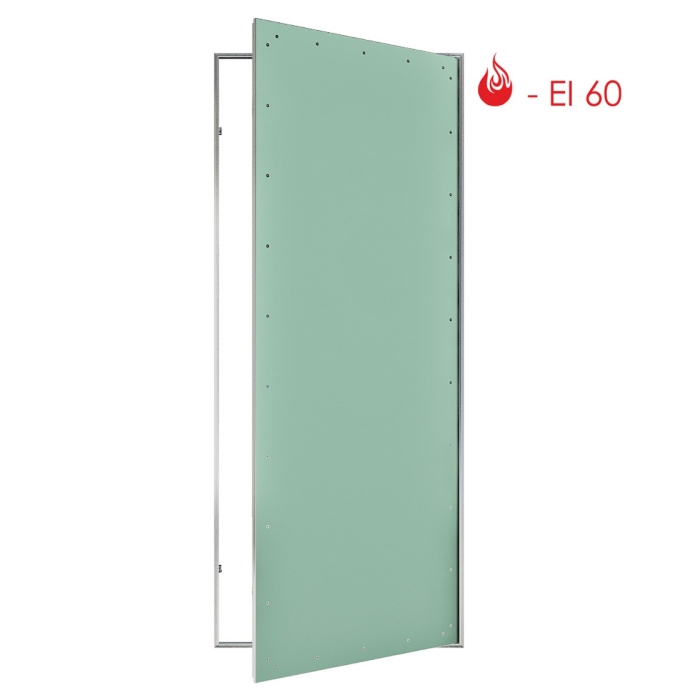 В исполнении с сертифицированным пределом огнестойкости EIS60 по контуру примыкания проклеивают терморасширяющийся материал, в створке прокладывают рулонный минеральный утеплитель и подшивают вторым слоем гипсокартона с тыльной стороны.